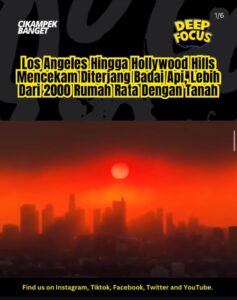 Internasional, ckpinfo.com – Los Angeles kini dalam kondisi mencekam hingga langit berwarna merah akibat kebakaran hutan. Lebih dari 2.000 rumah rata dengan tanah, termasuk rumah mewah puluhan artis Hollywood seperti Paris Hilton, Jamie Lee Curtis, Mandy Moore, James Wood, Jennifer Love Hewit, dll. Kebakaran dahsyat itu juga memaksa lebih dari 100 ribu penduduk mengungsi. Sedikitnya 5 orang tewas dalam peristiwa ini.