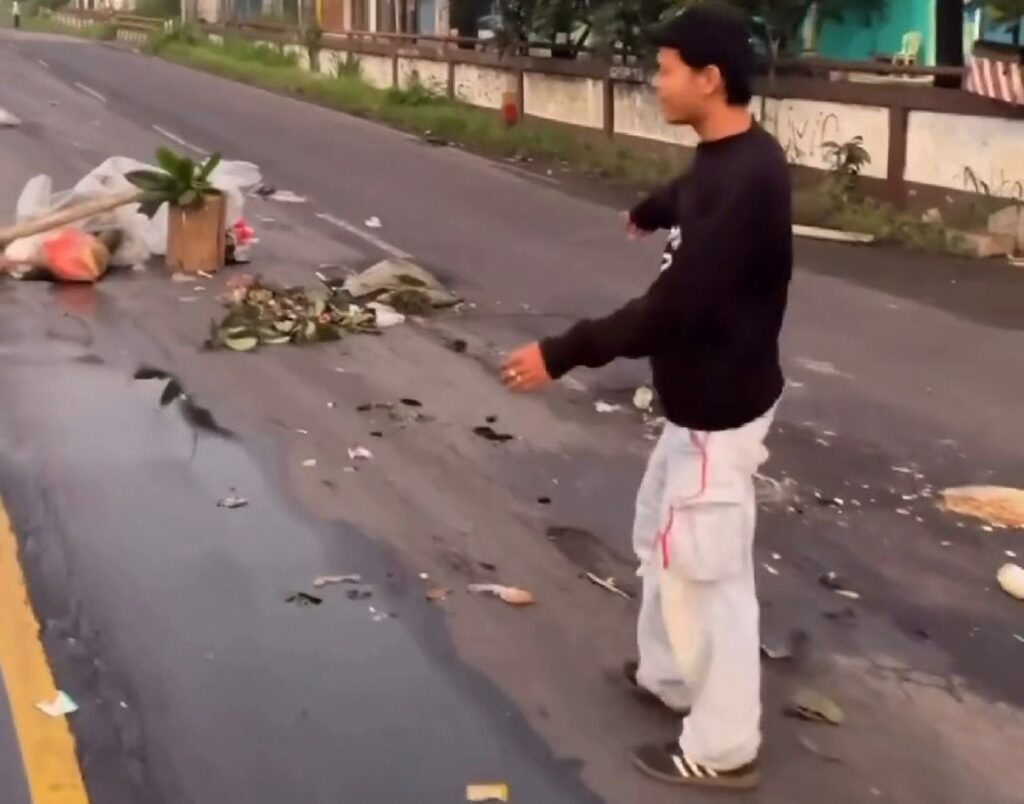 CIKAMPEK, ckpinfo.com – Seorang warga memperlihatkan kondisi memprihatinkan Jalan Raya Pantura di depan kawasan Sudirman yang hingga kini dipenuhi lubang di sejumlah titik. Untuk mengantisipasi pengendara yang melintas, warga terpaksa menumpuk sampah di dalam lubang jalan sebagai penanda darurat agar tidak menimbulkan kecelakaan, terutama pada malam hari.