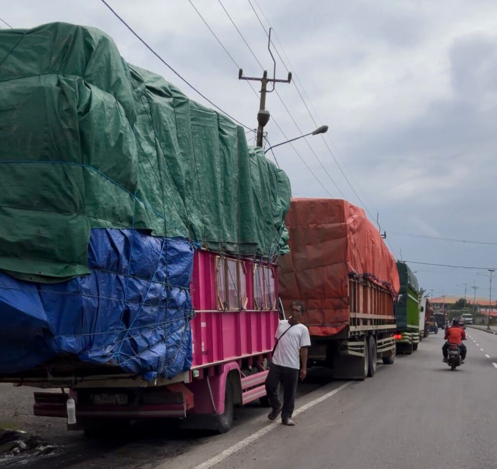 Pantauan di lokasi memperlihatkan petugas kepolisian juga berada di sekitar area, sementara truk-truk bermuatan besar berjejer di bahu jalan dan memakan sebagian badan jalan. Kondisi ini dinilai sangat membahayakan pengguna jalan lain, khususnya pengendara roda dua.