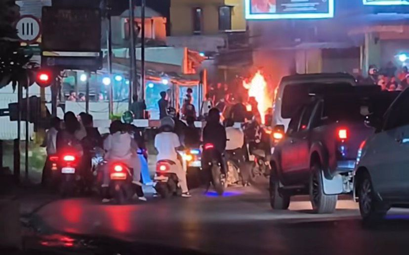 Dalam rekaman video yang beredar, tampak api membesar dan melahap bagian motor, sementara sejumlah warga berusaha membantu memadamkan kobaran api dengan alat seadanya. Belum diketahui penyebab pasti terbakarnya kendaraan tersebut.
